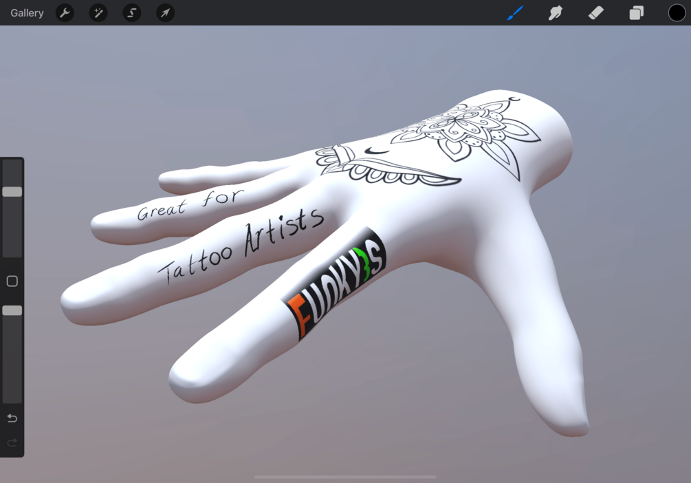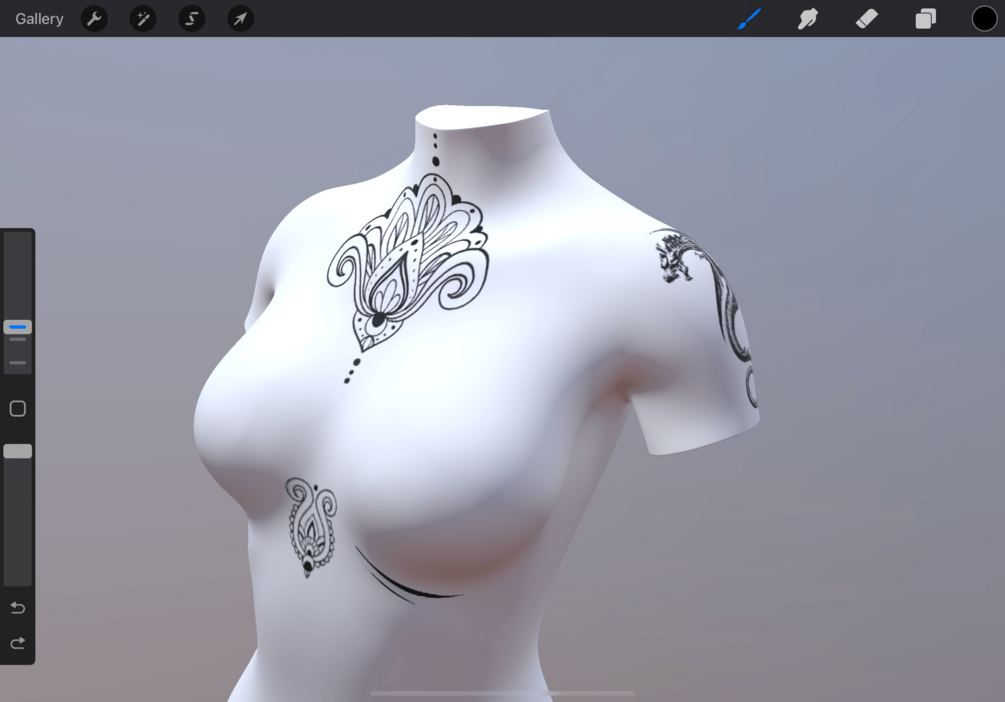 These 3d Models can be imported into Procreate where you can use your digital painting know how to design right on top of various parts of the body. It's even possible for the artwork to be exported to a 2d image for stencil!